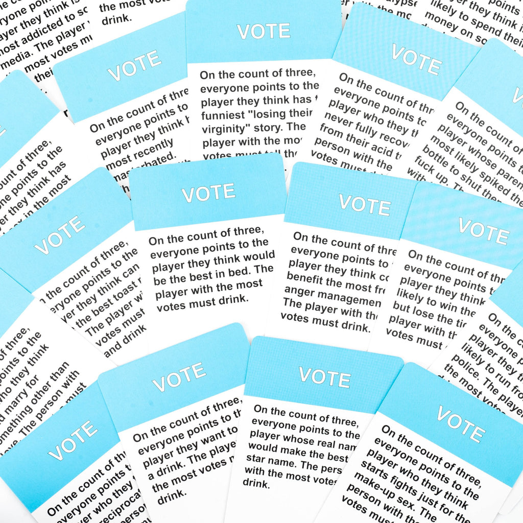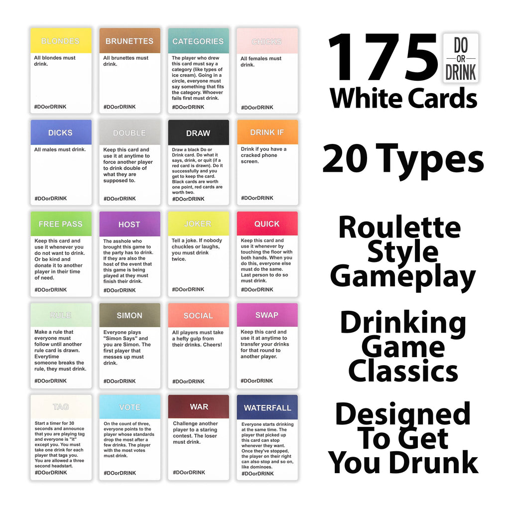 The game play is simple. Separate the white and black cards into two piles and shuffle. The first player draws a white card, reads it aloud, does what it says, then the next player does the same until someone picks up a white "DRAW" card. Once this happens then that player must draw a black from the other pile, read it aloud, and do what it says or drink. If the challenge on the card is completed successfully, the card can be kept by the player and counted as points. Some cards are far more challenging than others and therefore are worth more but also have greater consequences for failing to successfully perform the challenge. In the end, the player with the most points wins.