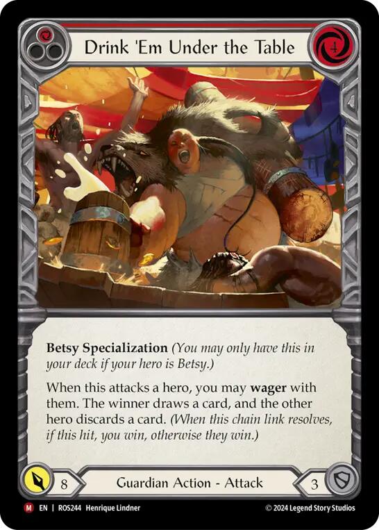 Betsy Specialization (You may only have this in your deck if your hero is Betsy.) When this attacks a hero, you may wager with them. The winner draws a card, and the other hero discards a card. (When this chain link resolves, if this hit, you win, otherwise they win.)