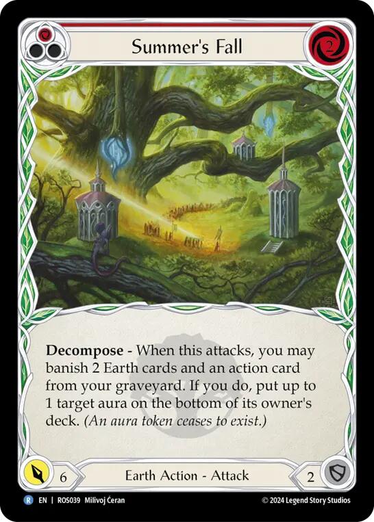 Decompose - When this attacks, you may banish 2 Earth cards and an action card from your graveyard. If you do, put up to 1 target aura on the bottom of its owner's deck. (An aura token ceases to exist.)
