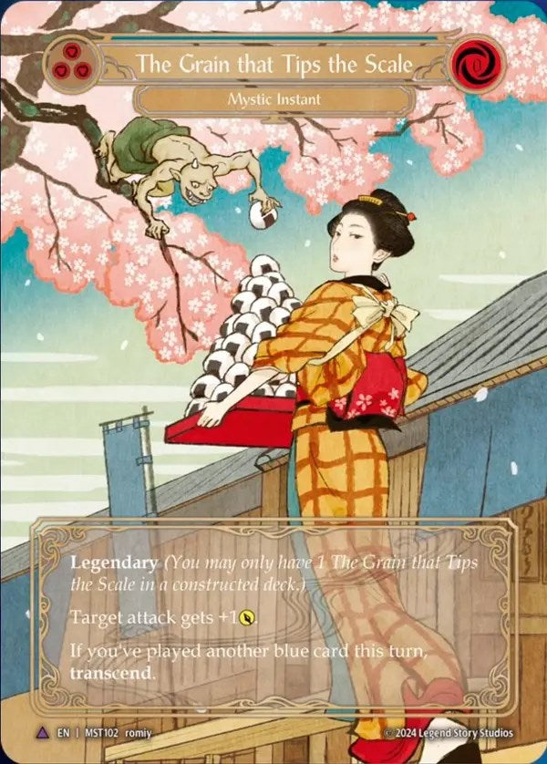 Legendary (You may only have 1 The Grain that Tips the Scale in a constructed deck. Target attack gets +1POWER If you've played another blue card this turn, transcend. Inner Chi ([Chi] can pay for [Chi] or [Resource] costs.) (Transcended from The Grain that Tips the Scale.)